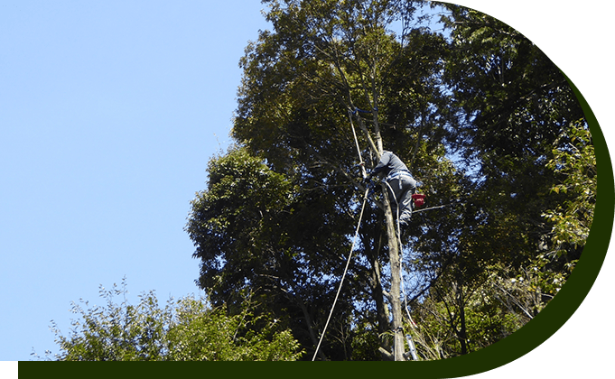 私達は、通常の伐採業者や造園業の方から依頼を受けて作業する特殊伐採を行っています。難度の高い状況での伐採がメインとなります。作業は当然は有資格者が対応します。10M以上登れるプロが在籍。今は高木に登れる職人非常に貴重な存在です。こんな高い木でも切れるのかと思われるような木でも対応できます。今までに伐採出来なかった木はございません。重機がはいらない所でも完全対応いたします。